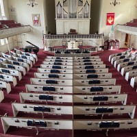 On October 18, I spent a couple hours with leaders at First Congregational Church in Westfield, Massachusetts (#44). I enjoyed hearing about an upcoming Halloween party for EVERYONE – kid-friendly food, candy, and games for all ages. A significant outreach to the community is the Blessed Buys Thrift Shoppe, occupying an adjacent building with rooms designated for books, household items, clothing, and more! A walk through the historic meetinghouse included a stroll through the balcony with impressive views of the pews and chancel. Windows at the front of the church provide a prime vantage point for looking out on the town square.