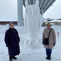 Starting with three heavy snowfalls in December, this winter was one of the snowiest in living memory. In Anchorage, people take snow in stride but worry about flooding during “break-up” in spring. Fur Rendezvous, a festival in the days leading up to the famed Iditarod sled dog race, delivers fun all over the city. Members of the First Congregational Church of Anchorage (#35) graciously carried me to events, beginning with the ice sculpture competition. At a melodrama about Alaska, I laughed and got showered with popcorn, which I also threw. At a native arts market, I purchased an Eskimo yoyo from. The woman from Quinhaguk, who crafted the yoyo filled with beans, demonstrate how to play with it.