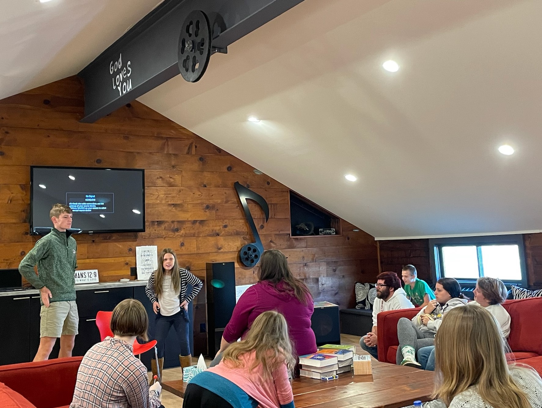 Sunday School at First Congregational Church, Marshalltown, Iowa (#15) takes place in the Loft before the service. One class of all ages plays a game together and is learning to memorize the books of the Bible.